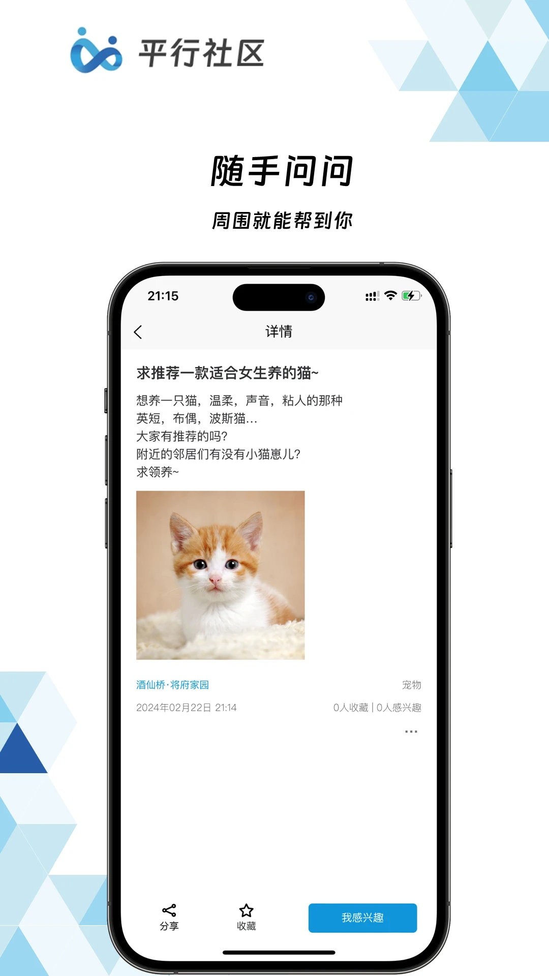 从日常琐事到人生大事,从物质需求到精神交流,平行社区都能满足你的期待。我们相信,科技应该让生活更美好,互联网应该更有温度。加入平行社区,开启你的温暖社交新体验,让我们一起创造更美好的社区生活!