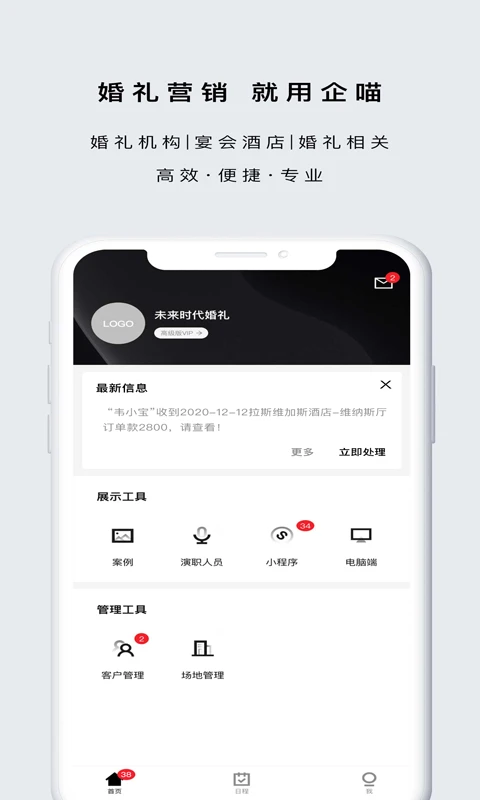 企喵是专为婚嫁行业量身定制的智能营销管理平台,通过整合APP、PC端和微信小程序三大终端,为婚礼产业链提供一站式数字化解决方案。该系统深度融合了线上婚礼微店、智能CRM客户管理、自动化OA运营、智能日程提醒和门店谈单等核心功能模块,实现多平台数据无缝对接与协同操作。凭借其强大的私域流量运营能力和精准营销工具,企喵已帮助全国150多个城市的3000多家婚企客户显著提升工作效率、优化客户转化路径并实现业绩增长,成为婚礼公司、主题宴会酒店、婚纱礼服馆及婚礼服务团队不可或缺的数字化助手。