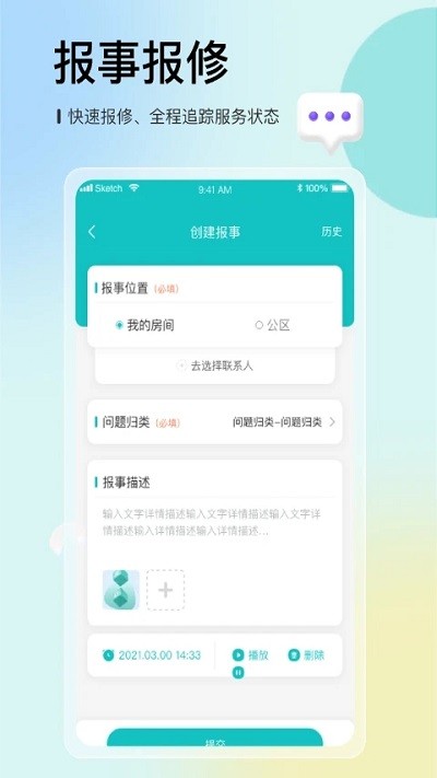 一键报事报修维修过程可视化一键评价,系统自动分派最近维修人员,实时推送进度通知,维修完成后可对服务进行星级评分,形成完整的服务闭环。