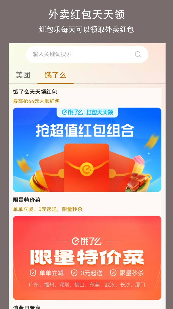 【外卖红包】每天都能领取超值外卖大额红包,点外卖更省钱!无论是午餐、晚餐还是夜宵,红包乐都能为你提供最优惠的外卖折扣,让你享受美食的同时还能省下一大笔钱。无论是美团、饿了么还是其他外卖平台,红包乐都能为你提供专属优惠!