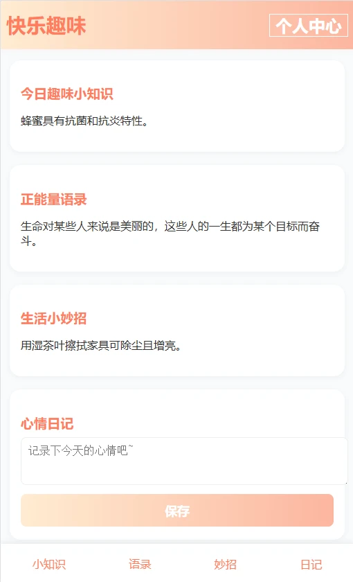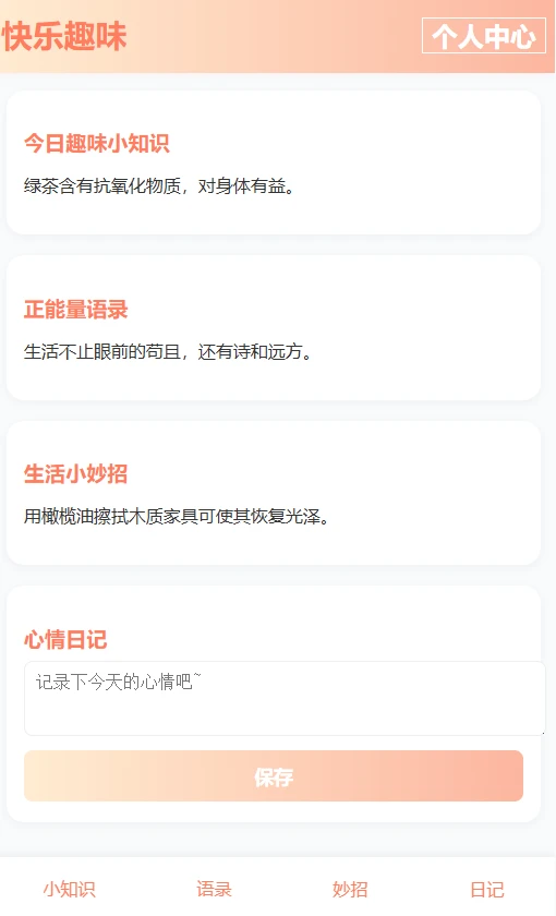 《快乐趣味》是一款专为热爱生活、追求知识乐趣的用户打造的文字类应用。这款应用每天为您精心推送各类有趣的知识点、温暖人心的励志语录以及实用的生活小技巧,让您在碎片化时间里也能收获满满的惊喜与启发。无论是通勤路上还是休息间隙,打开应用就能发现新鲜有趣的内容。同时应用内置的心情日记功能,让您随时记录生活点滴,培养积极乐观的心态,真正实现"快乐每一天"的生活理念。
