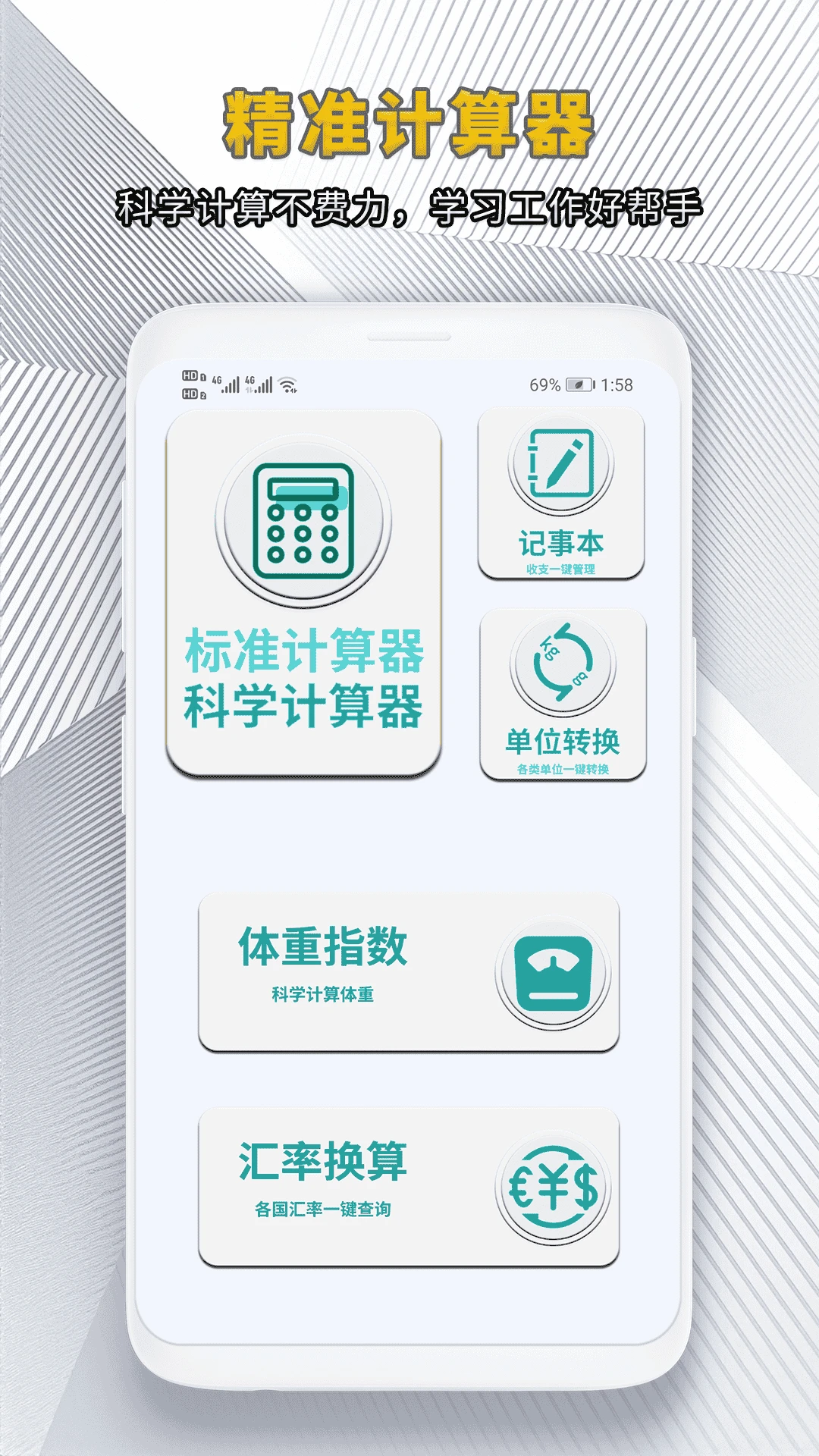 单位换算功能覆盖了日常常用的各种单位类型,包括长度、面积、体积、压强、功率以及存储单位等,让单位转换变得轻松简单。体重指数计算器可以帮助用户快速计算身体质量指数,随时掌握自己的健康状况。