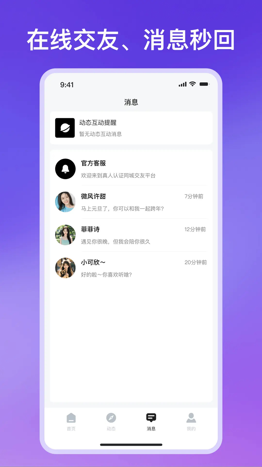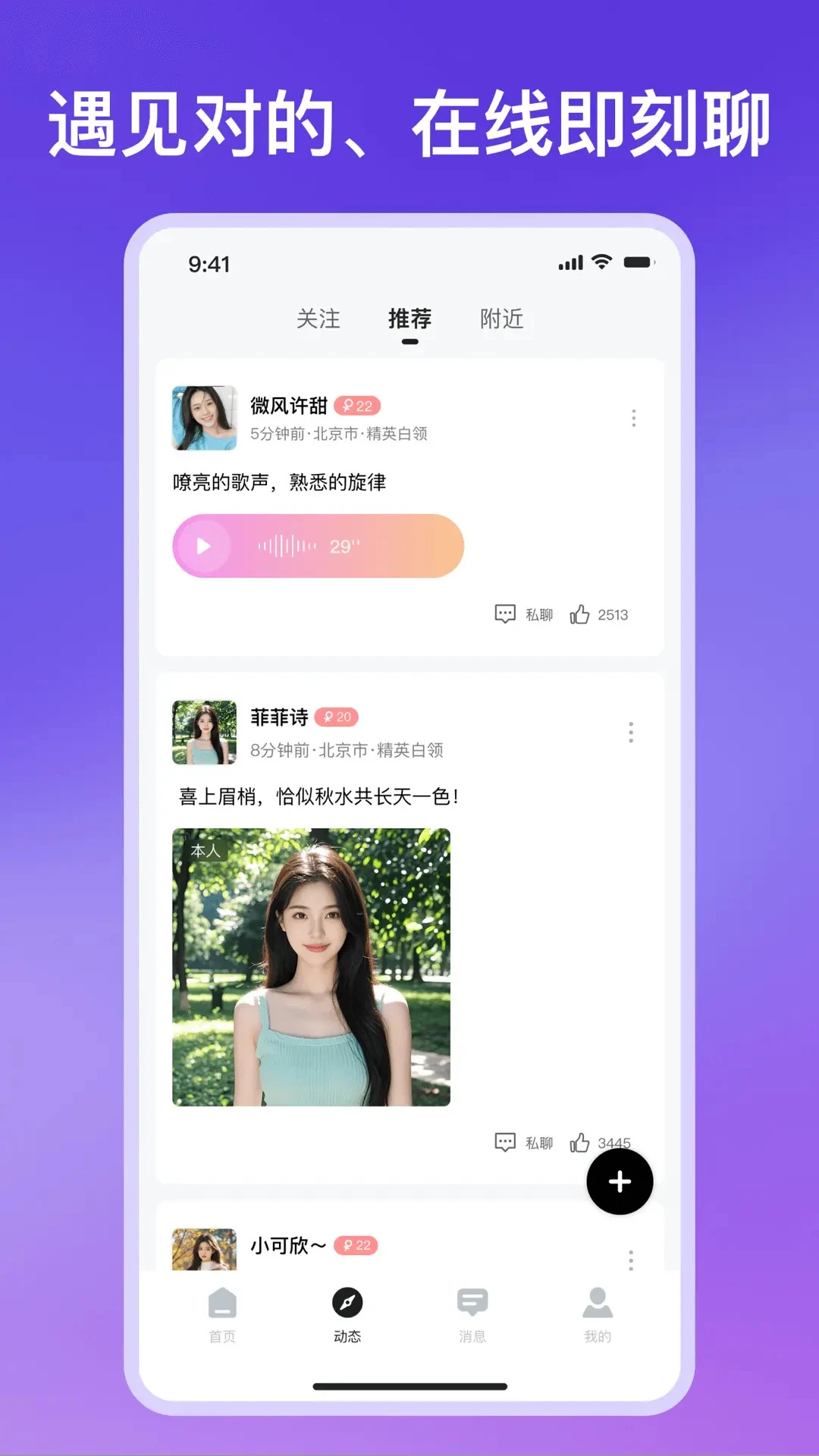 【高效】基于LBS定位技术,精准推荐附近优质单身用户,支持多种筛选条件快速匹配。独创的"闪电约会"功能让同城面基更便捷,打破传统交友的时间空间限制。