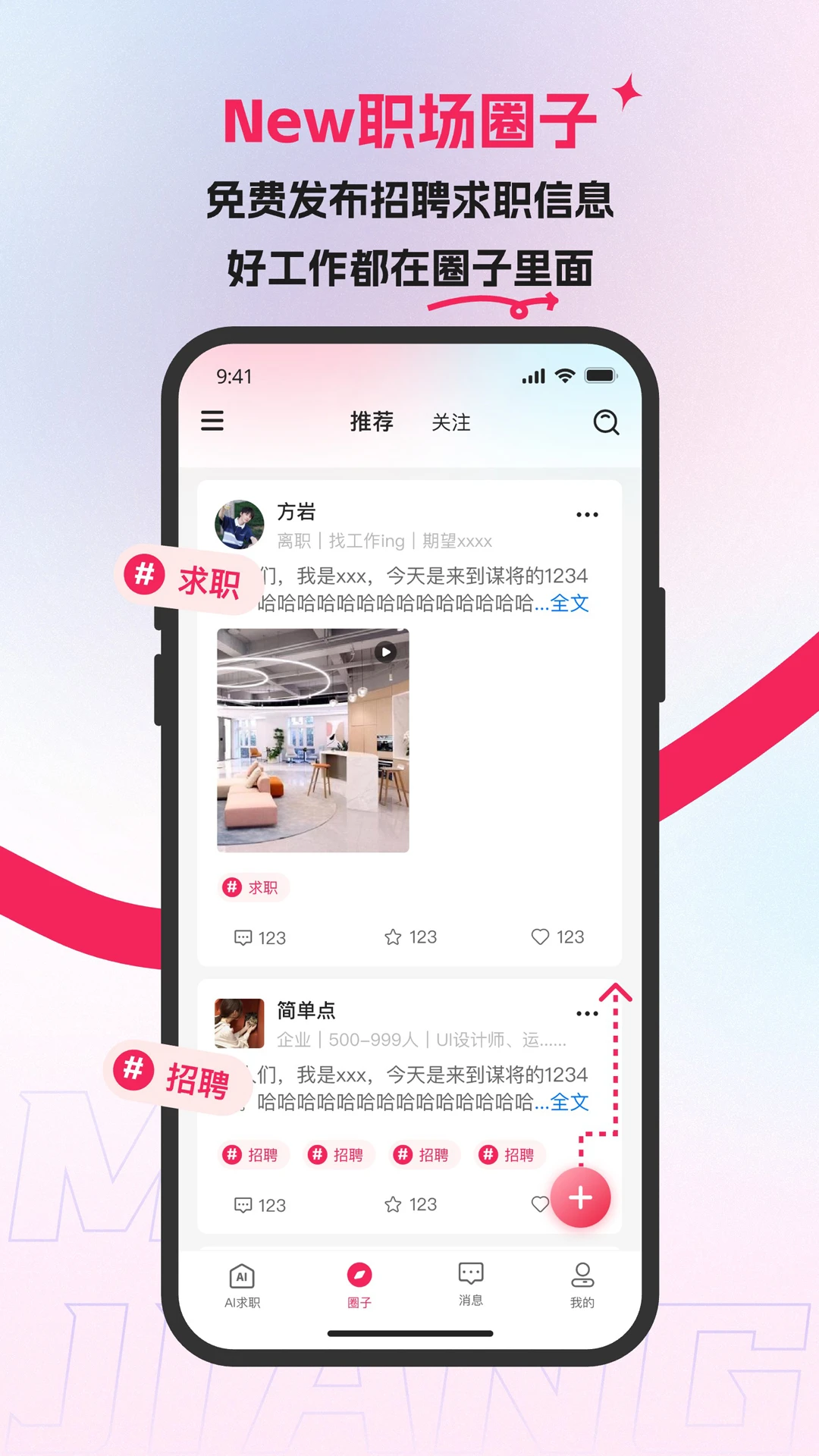 作为当下最受年轻职场人欢迎的社交化求职平台,谋将AI视聘不仅提供传统招聘功能,更打造了一个充满活力的职场社交生态。在这里,用户可以建立个人职业档案,拓展职场人脉,参与行业讨论,还能通过创新的视频互动功能展示自己的专业能力。平台独特的职场社区让求职招聘过程变得更有温度,真正实现了"找工作"到"经营职业"的转变。
