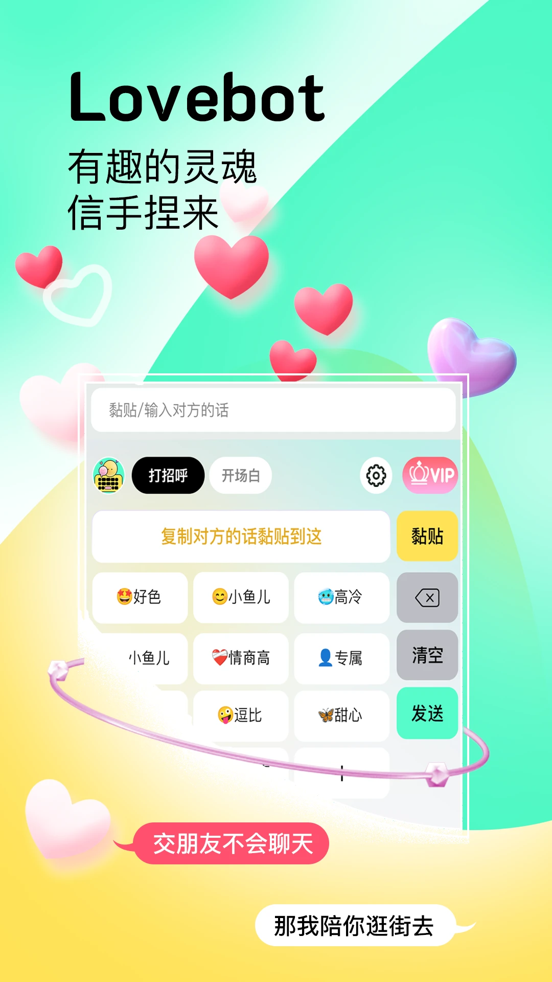 想要让聊天变得轻松有趣吗?LoveBot键盘是您的最佳选择!这款智能应用专为提升社交体验而设计,无论面对恋人、同事还是朋友,都能帮您化解尴尬、激发话题。它不仅能提供多样化的回复建议,还能根据对话场景智能推荐话术,让您的每句话都恰到好处。操作简单直观,只需轻点屏幕就能获得自然流畅的对话方案,彻底告别词穷和冷场的烦恼。现在就来体验LoveBot键盘,发现沟通的无限可能!