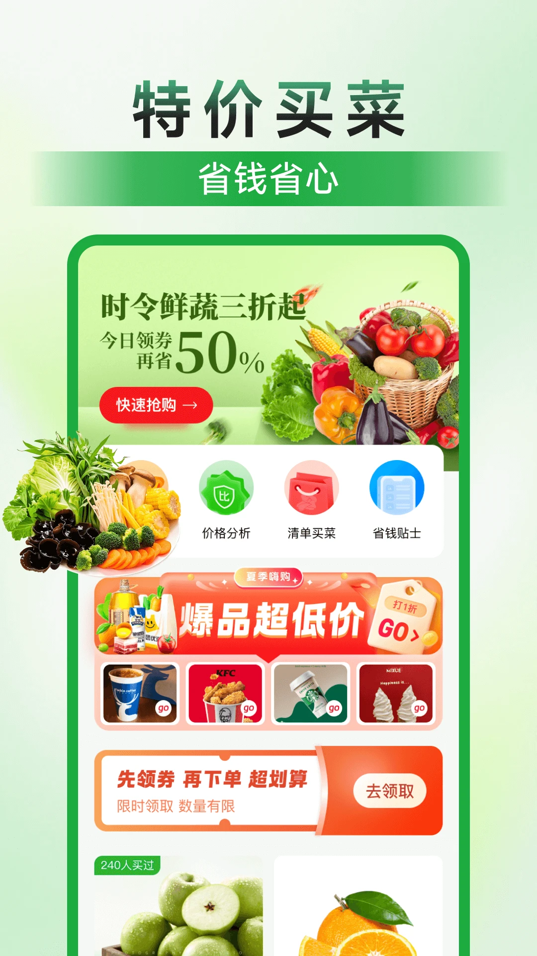 特价买菜省钱致力于为用户提供循序渐进的购物体验,无论是日常买菜、外出就餐还是网购消费,都能助您轻松省钱。应用界面简洁友好,操作简单便捷,让每一位用户都能享受到智慧购物的乐趣。立即下载特价买菜省钱,开启您的精明消费新生活,让每一分钱都花得更有价值!