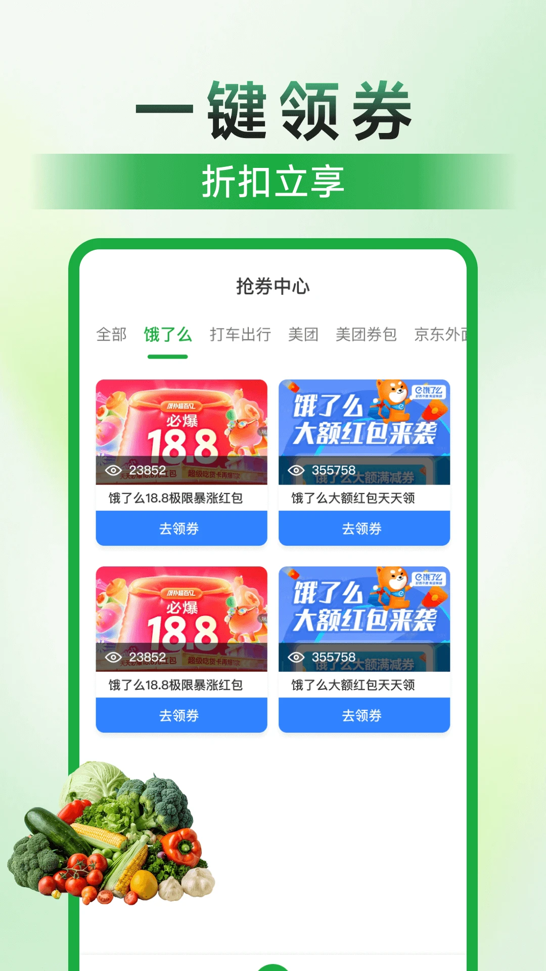 抢券中心:这里汇集了海量优惠券和红包资源,覆盖饿了么、打车出行、美团、京东等多个主流消费平台。用户可以根据自己的消费习惯和需求,轻松领取各类优惠券,享受实实在在的折扣优惠。