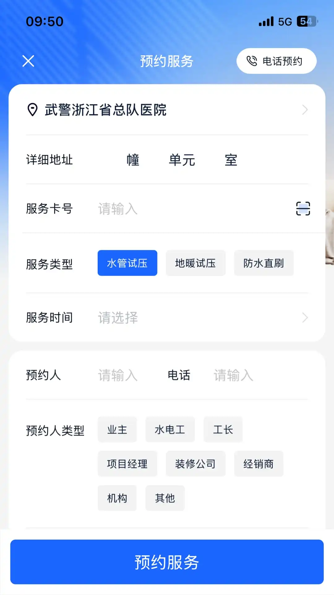 一键预约功能,支持水管试压、地暖试压、防水直刷等多种服务的快速预约