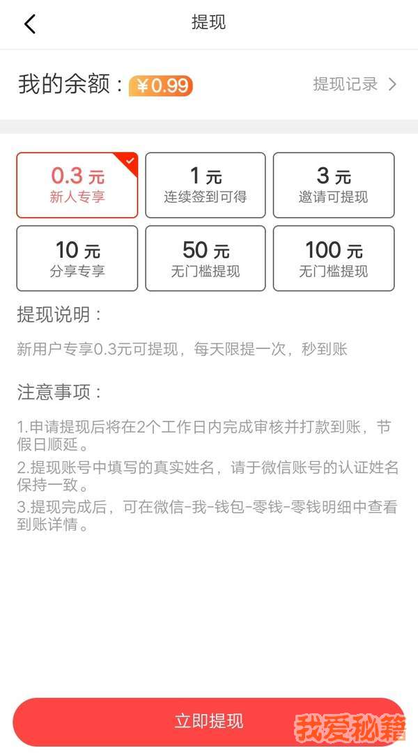 高效便捷的提现方式,最低1元即可提现,支持微信和支付宝两种方式。提现申请提交后系统秒审核,资金即时到账,完全不用担心提现门槛高或到账慢的问题。