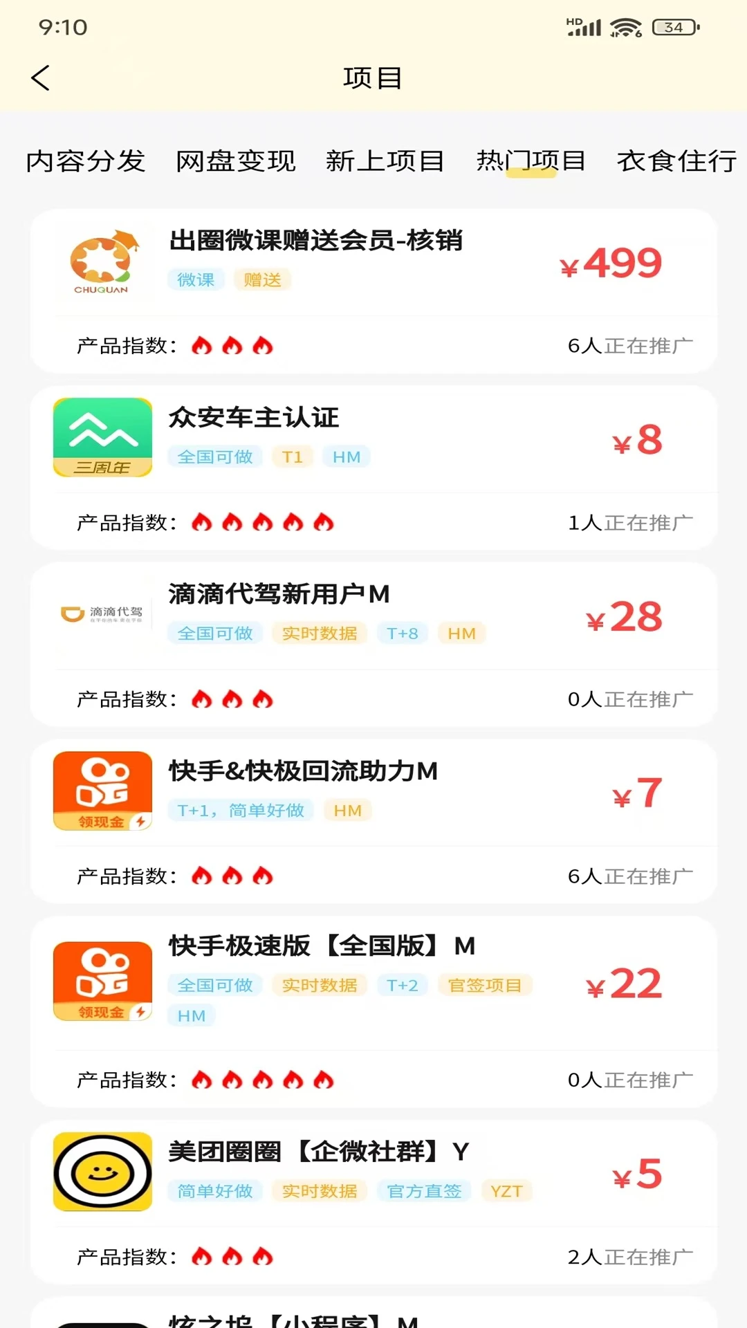 出圈提供多样化的推广项目,涵盖地推、APP拉新、小游戏推广等多个领域。
