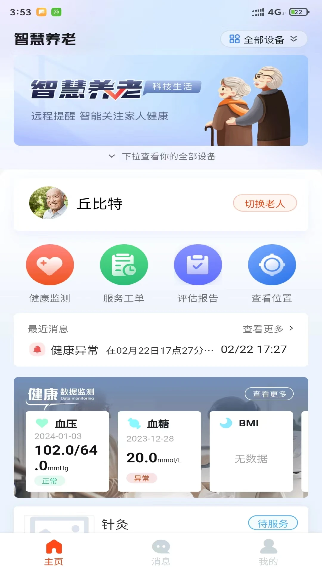 智能健康监测:通过可穿戴设备实时采集老人心率、血压等健康数据,异常情况自动预警