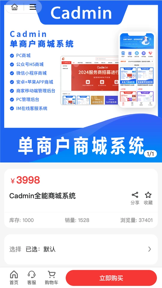 Cadmin全能商城系统提供完整的电商解决方案,涵盖商品管理、订单处理、支付对接等功能。