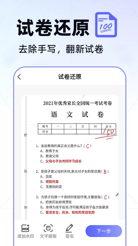 试卷还原:通过拍照还原试卷打印效果,方便归类整理,助力学生高效复习。