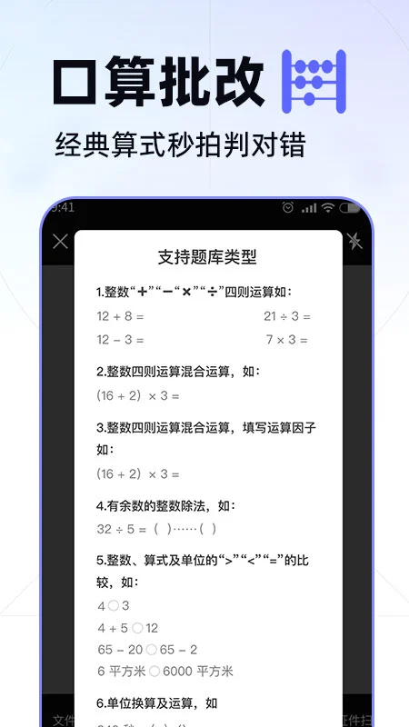 口算批改:支持整数四则运算、混合运算、比较大小等多种数学题型批改,覆盖全面。