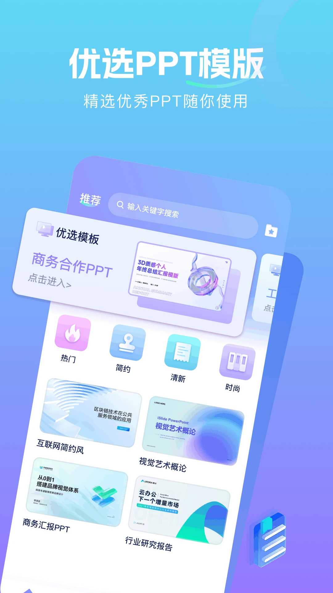 海量模板选择:应用内拥有优选PPT模版库,涵盖商务合作、年终总结、行业研究报告等多种类型。无论是商务汇报、学术展示还是个人分享,用户都能快速找到契合主题的模板,节省设计时间。例如“区块链技术在公共服务领域的应用”“从0到1搭建品牌视觉体系”等模板,适配不同专业领域内容展示。