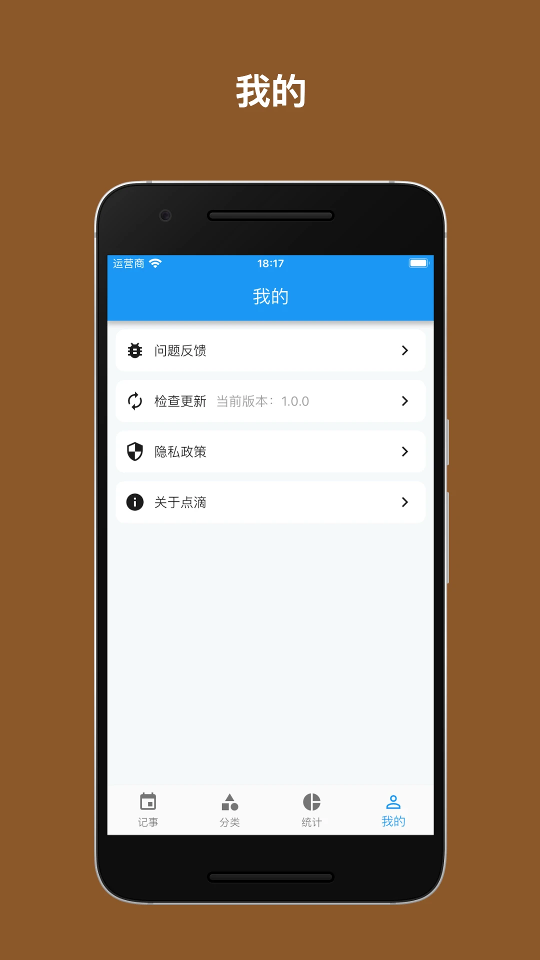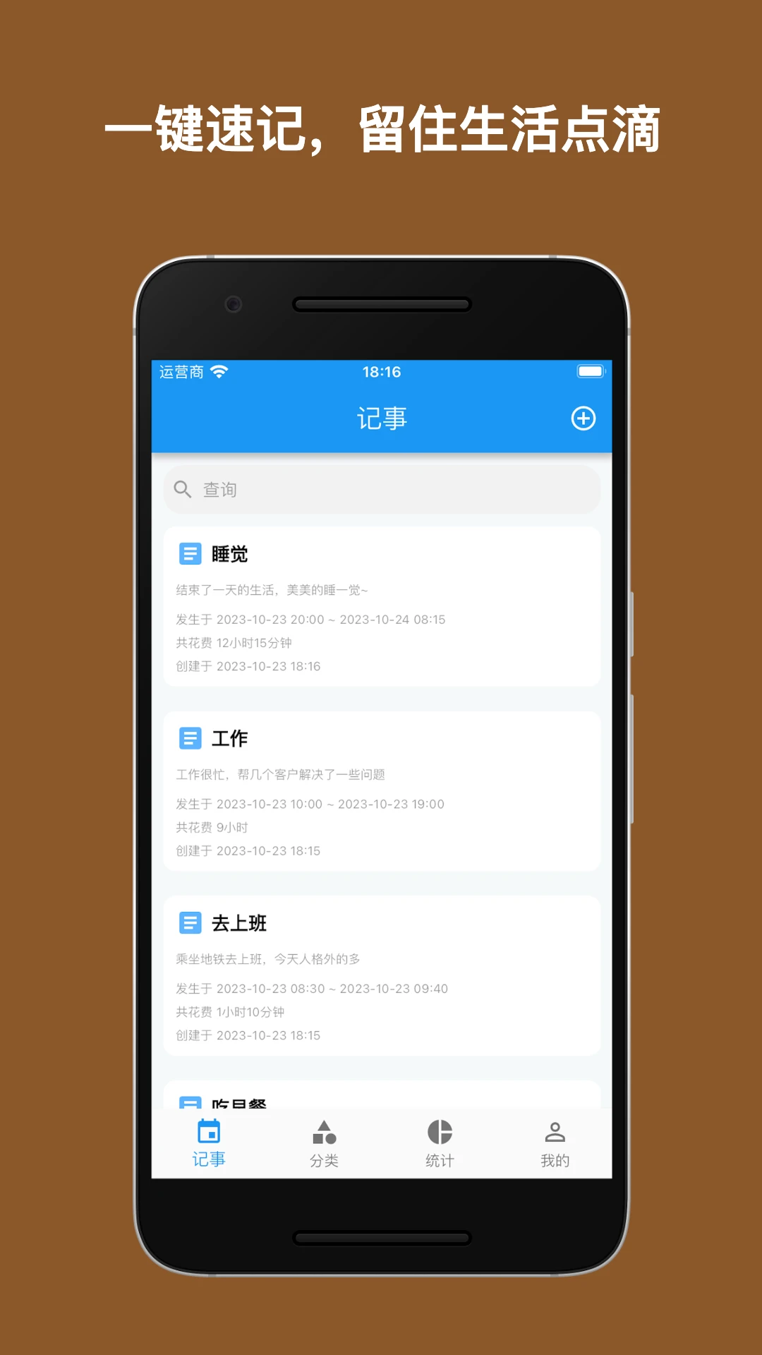 点滴是一款可以帮您分析时间的应用。曾几何时,我们忙忙碌碌,日复一日,但当我们回首时却发现时光已经在不经意间与我们擦肩而过,我们去努力回忆,但却无法清晰的记起时间都去哪里了。打开它,点滴会帮您统计各种事情的花费时间,让您清楚的看到时间去向,让您更好的分析、规划您的时间。