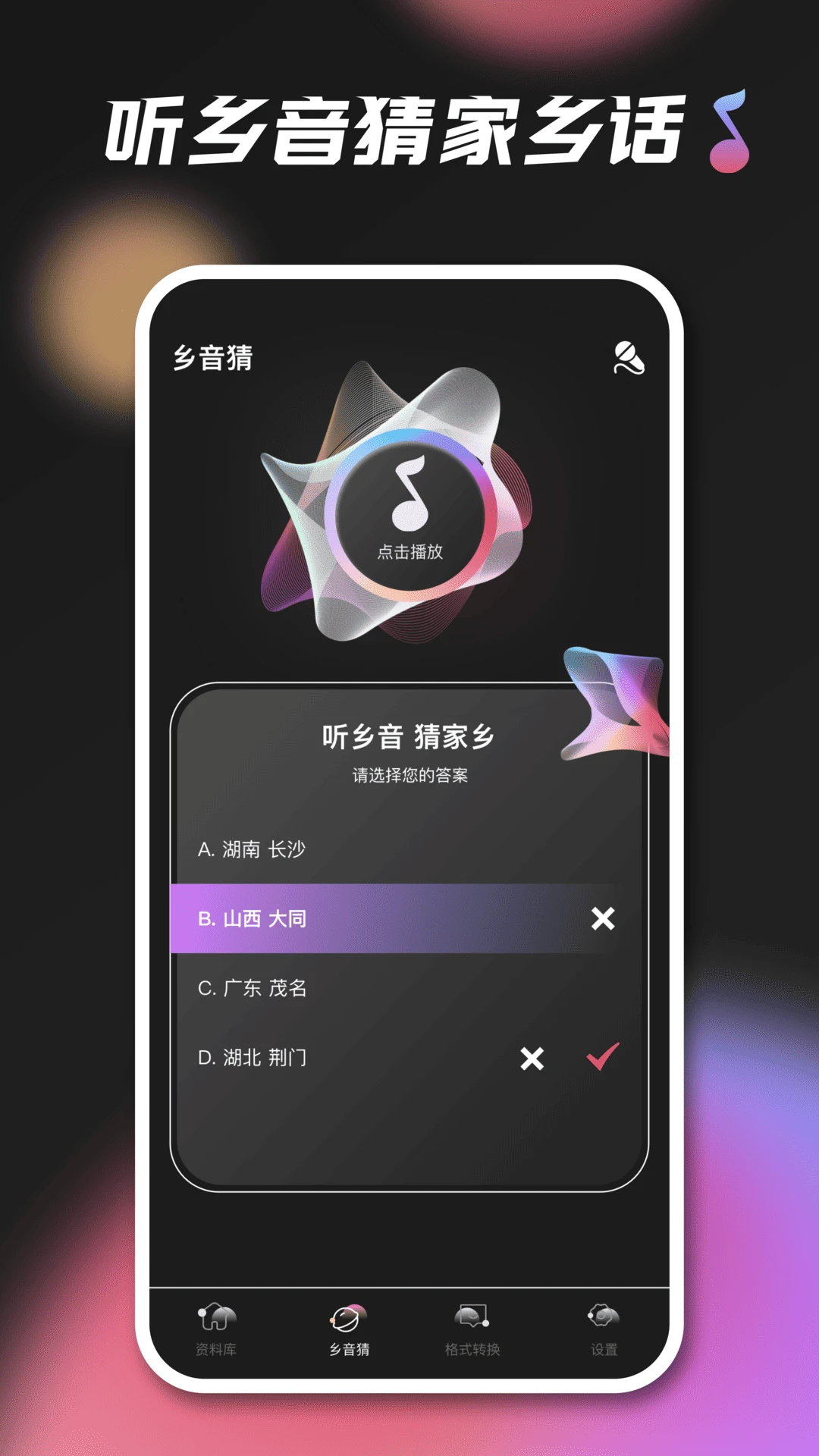 乡音猜玩法:通过听辨方言猜词义,答对进入下一关,答错触发趣味惩罚机制。