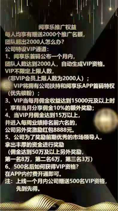 VIP特权说明:在阅享乐首码公布后的一个月内,如果团队成员达到2000人(二级以内),将自动晋升为VIP会员。VIP会员不设团队人数上限(普通会员上限为2000人)。不过要达到2000人的团队规模确实有一定难度,但一旦达成,每天200元的稳定收益还是非常可观的。
