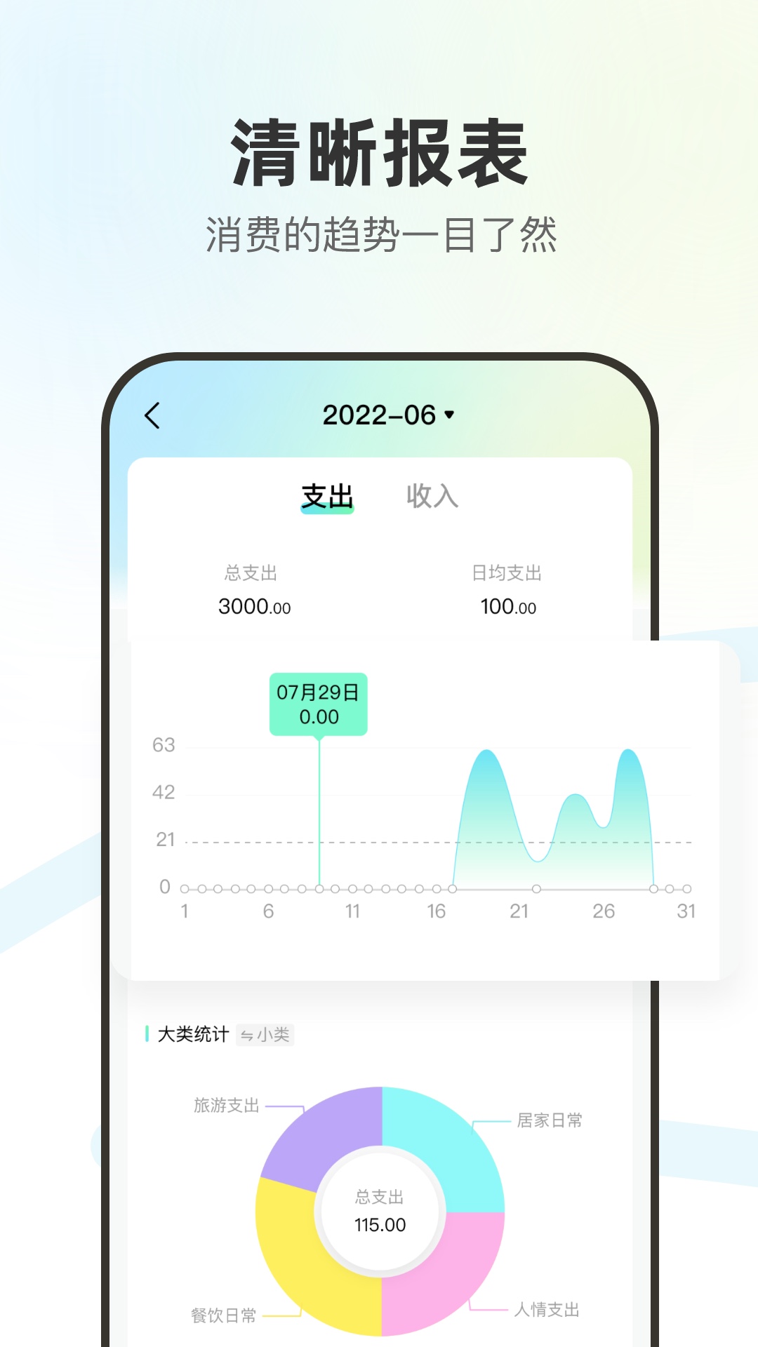 「统计图表」直观的环形图、柱状图等多种图表展示,支持按日/周/月/年多维度分析,让您一眼看清收支趋势