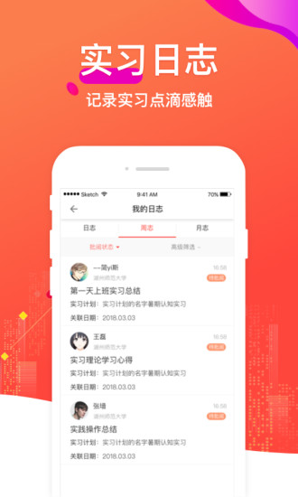 实习记录:支持图文并茂的实习日志分享,可以随时查看成长轨迹,与校友、同学互相鼓励共同进步。