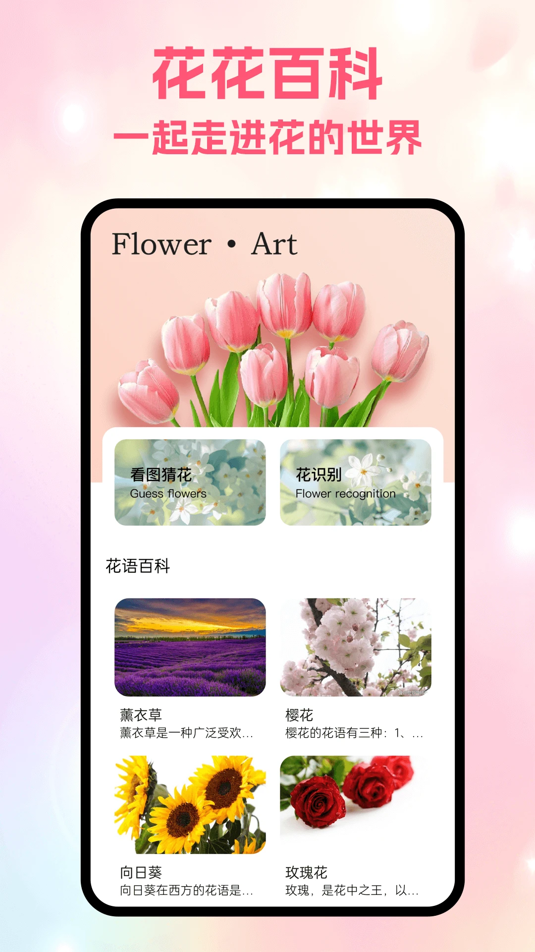 打造花艺生活美学平台:花语百科解析全球花卉文化寓意,看图猜花挑战植物认知趣味互动,花卉识别辅助拍摄辨种并推荐养护贴士,养花教学手把手指导光照/浇水/修剪技巧,精选花主题壁纸每日更新自然灵感。从识花到养花,让自然之美融入数字生活!