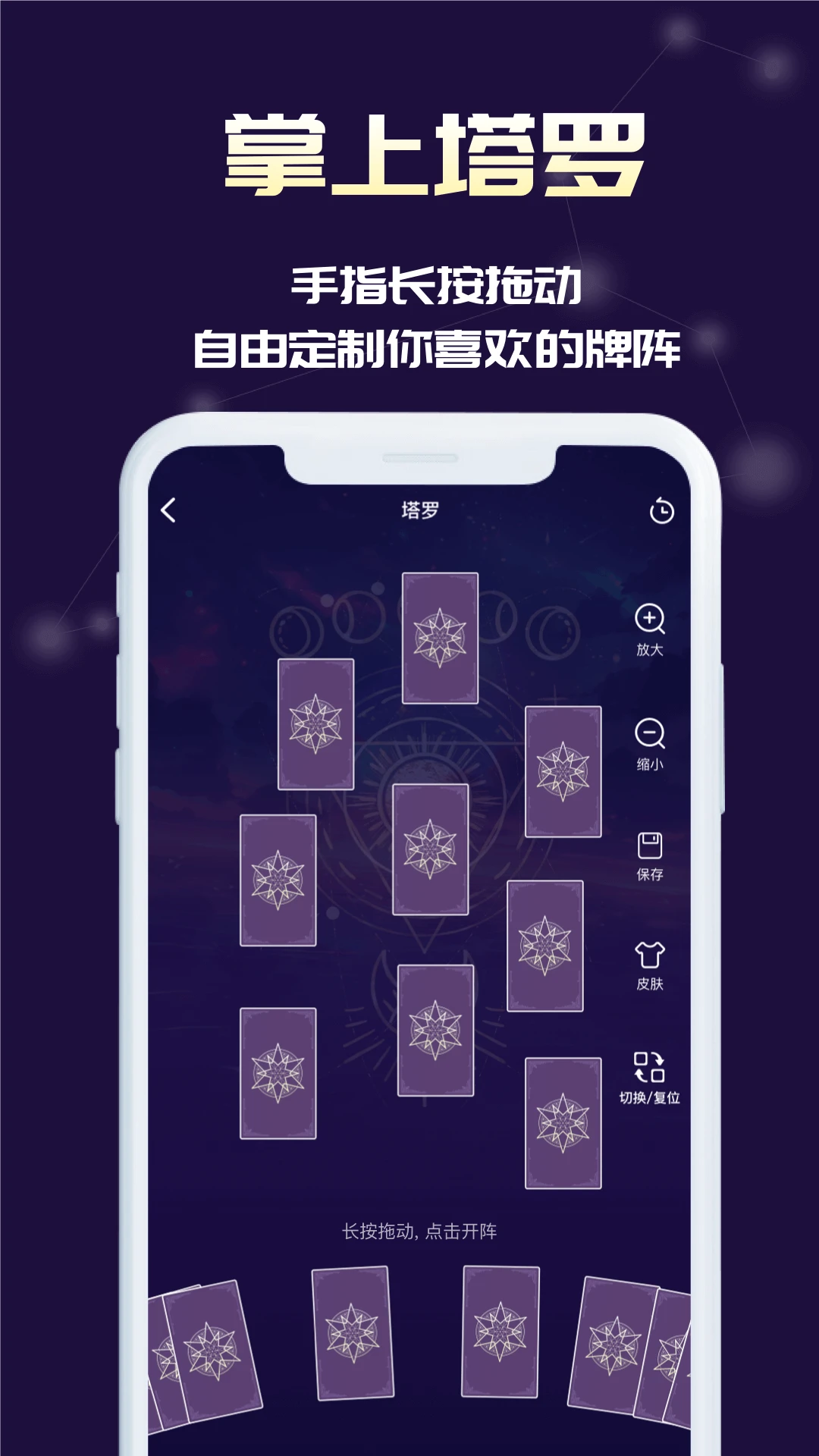 (2)多种牌阵供你选择,包括圣三角、吉普赛十字、自定义牌阵。跟随指尖滑动,自定义你需要的牌阵,附有别具一格的解析。