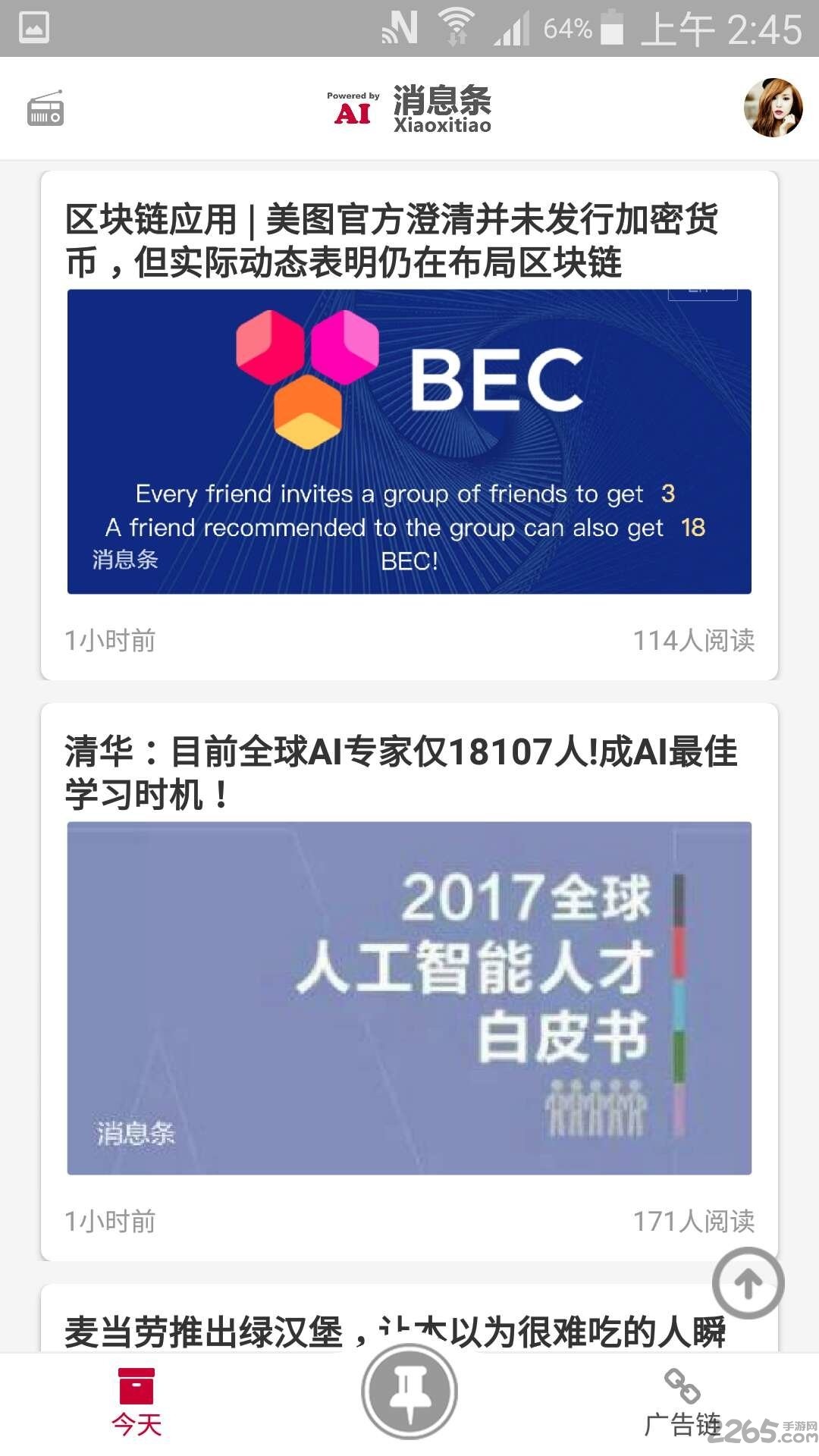 《消息条》是一款基于强大AI技术的智能新闻阅读软件,由北京智核信息技术有限公司精心打造。它通过先进的算法精准识别并屏蔽垃圾新闻、标题党等低质量内容,为用户打造纯净的阅读环境。无论何时何地,您都能通过这款应用获取24小时实时更新的海量精品资讯,涵盖新闻、财经、科技、体育、时尚等近20个热门领域,让您足不出户即可纵览天下大事。