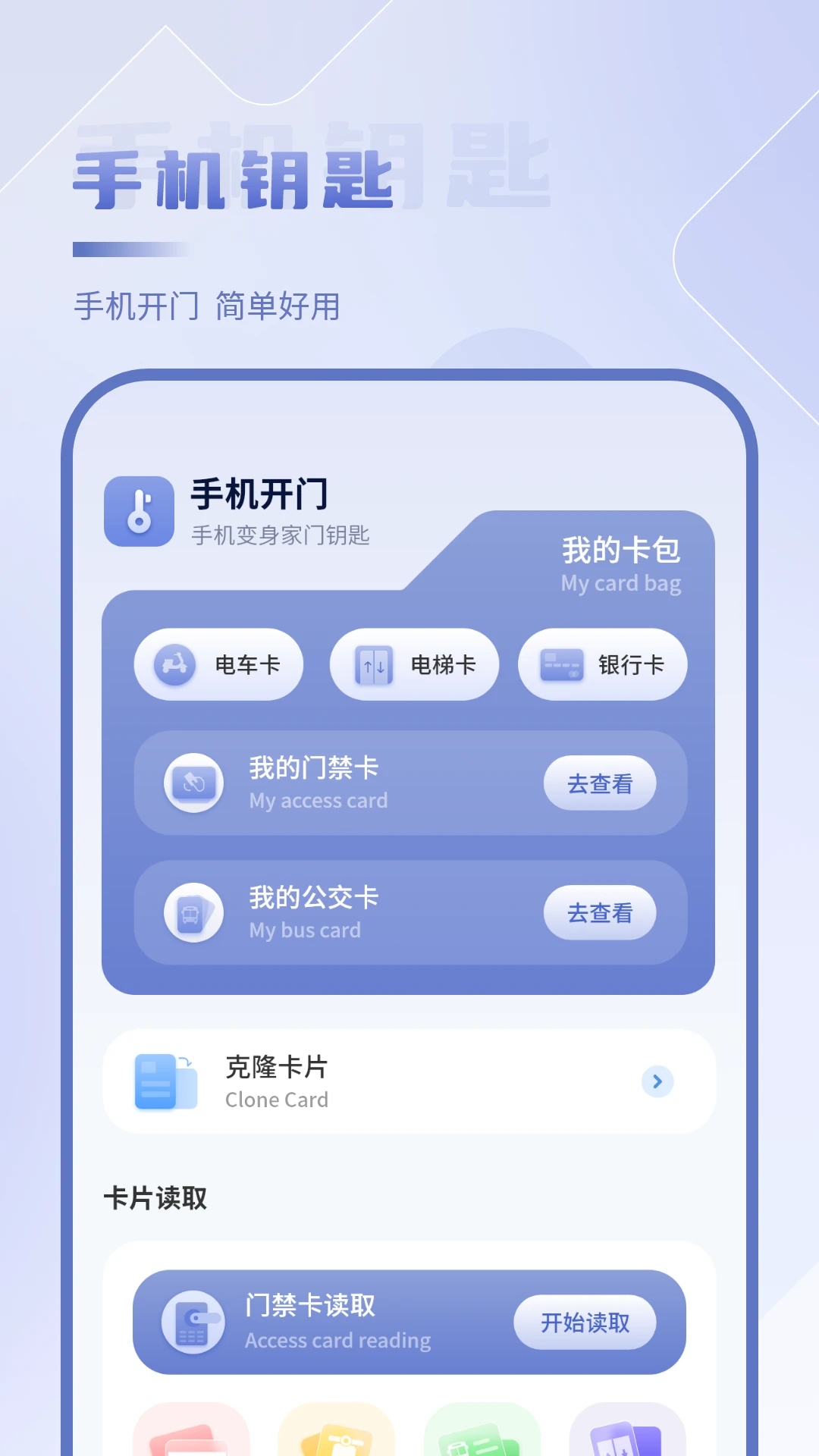 这是一款帮助您写入和读取NFC标签的小工具,它可以将支持NFC的手机或其它电子设备当成借记卡、公交卡、门禁卡等IC卡使用,通过判断手机是否支持NFC功能,支持读取、写入,如一般的门禁卡,电梯卡、停车卡等功能。同时APP中还添加了壁纸的功能应用。