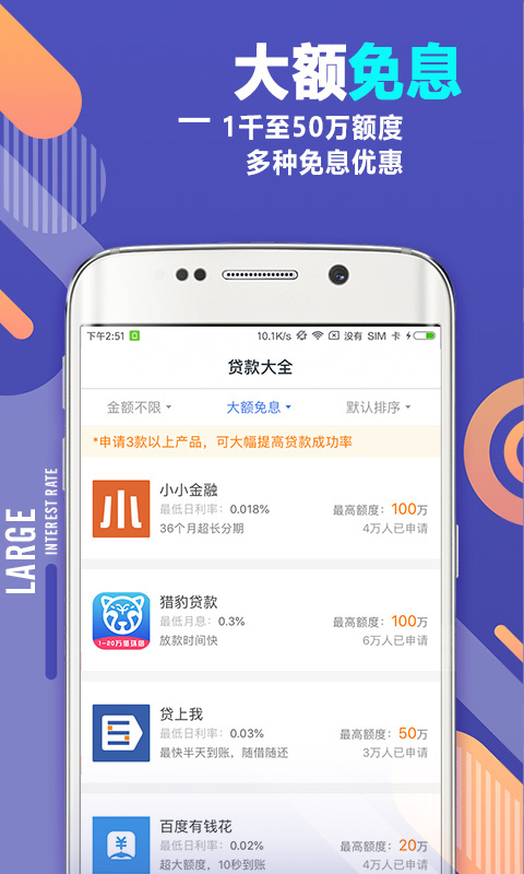 51借款为您财富,手机在线借款,轻松搞定!平台采用智能风控系统,确保借贷安全可靠。随借随还,不提款不计息,让您用款更灵活。月光族怎么破?找朋友借伤感情,当啃老族又不愿;平台提供多种借款产品,满足不同场景需求。好不容易等到商品打折,新的电子产品终于上市啦;单身终于遇见想要追求的男神女神;族想创业还差了一笔资金,想换一辆帅气的汽车却发现资金库不够...通通不用担心,找51借款来帮忙。提供小额借款,当天到账,借款毫无压力,费用划算,现金分期,消费分期,借款还享积分送好礼。平台还提供专业的理财建议和资金规划服务,帮助您更好地管理个人财务。