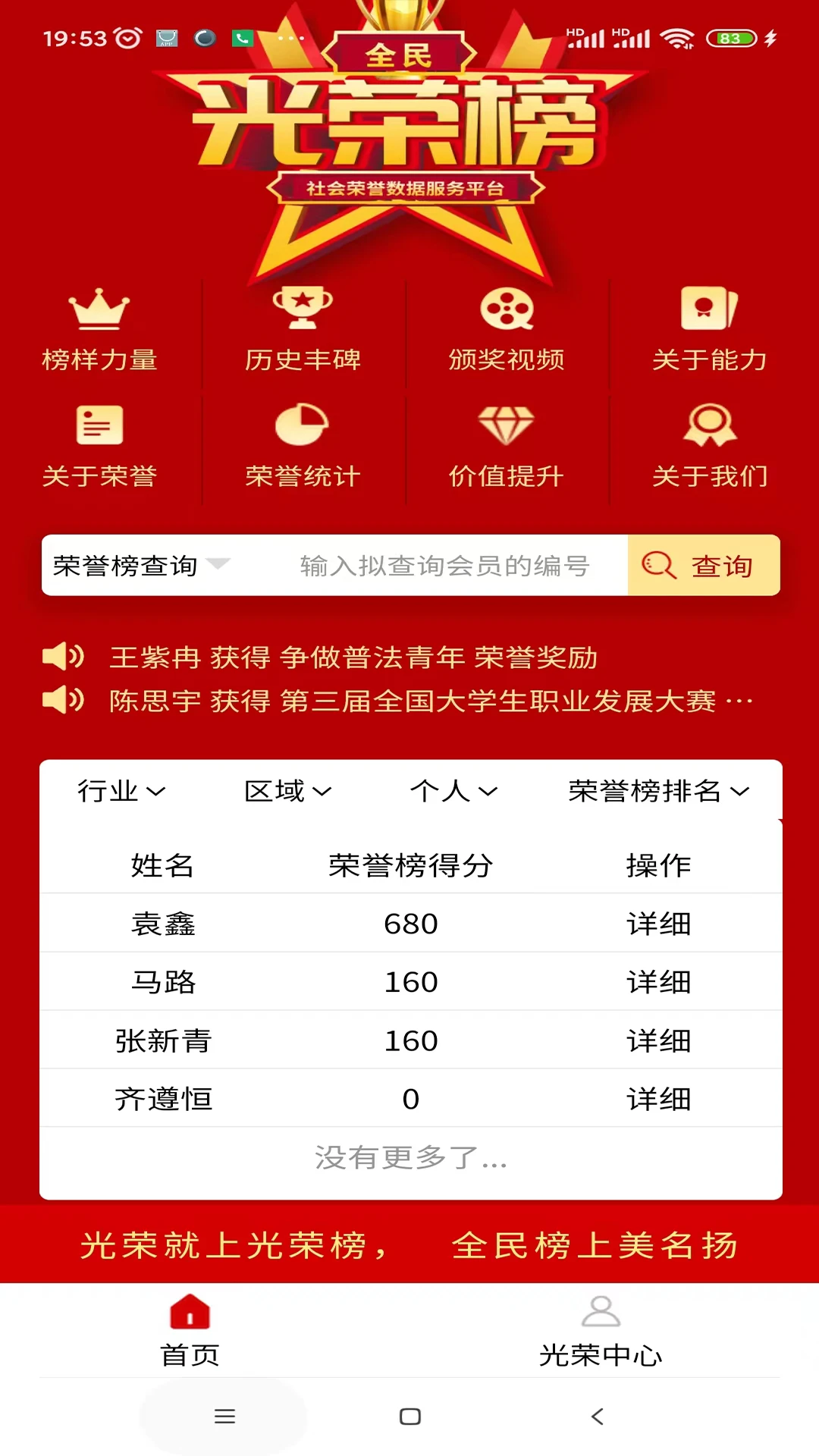 《光荣榜》是一款专注于收集和公示社会各级各类先进奖励与违规处罚名单的数字化平台。它通过系统化整合分散的奖罚数据,为授罚决定机构提供强大的数据库支持,助力其开展基于数据的深度研究,同时为个人或机构打造集中展示荣誉与处罚记录的空间。平台不仅强化了奖罚的社会影响力,还为社会公众提供了权威、可信的荣誉资讯与评价依据,成为连接机构、个人与社会的重要信息纽带。