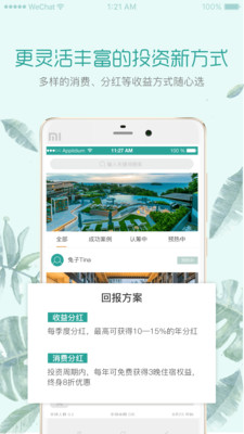 更灵活丰富的投资新方式:平台提供超低起投金额和多样化的收益方式选择,包括现金分红和实物收益等。投资者不仅能获得稳定的现金回报,还能获得精品酒店、民宿的住宿券等实物收益,满足不同投资者的个性化需求,让投资收益更加丰富多彩。