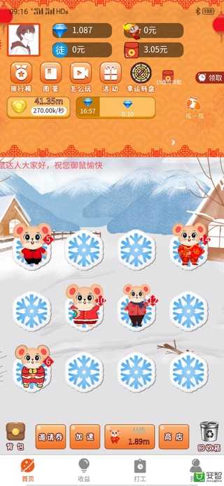 在贺岁鼠中,玩家可以通过合成不同等级的小老鼠来解锁更多稀有品种,每成功合成一次都能获得相应的收益奖励。游戏采用简单直观的操作方式,即使是新手也能快速上手。随着老鼠等级的提升,玩家将获得更高的收益回报,同时还能解锁更多有趣的玩法和挑战,让合成过程充满惊喜和成就感。