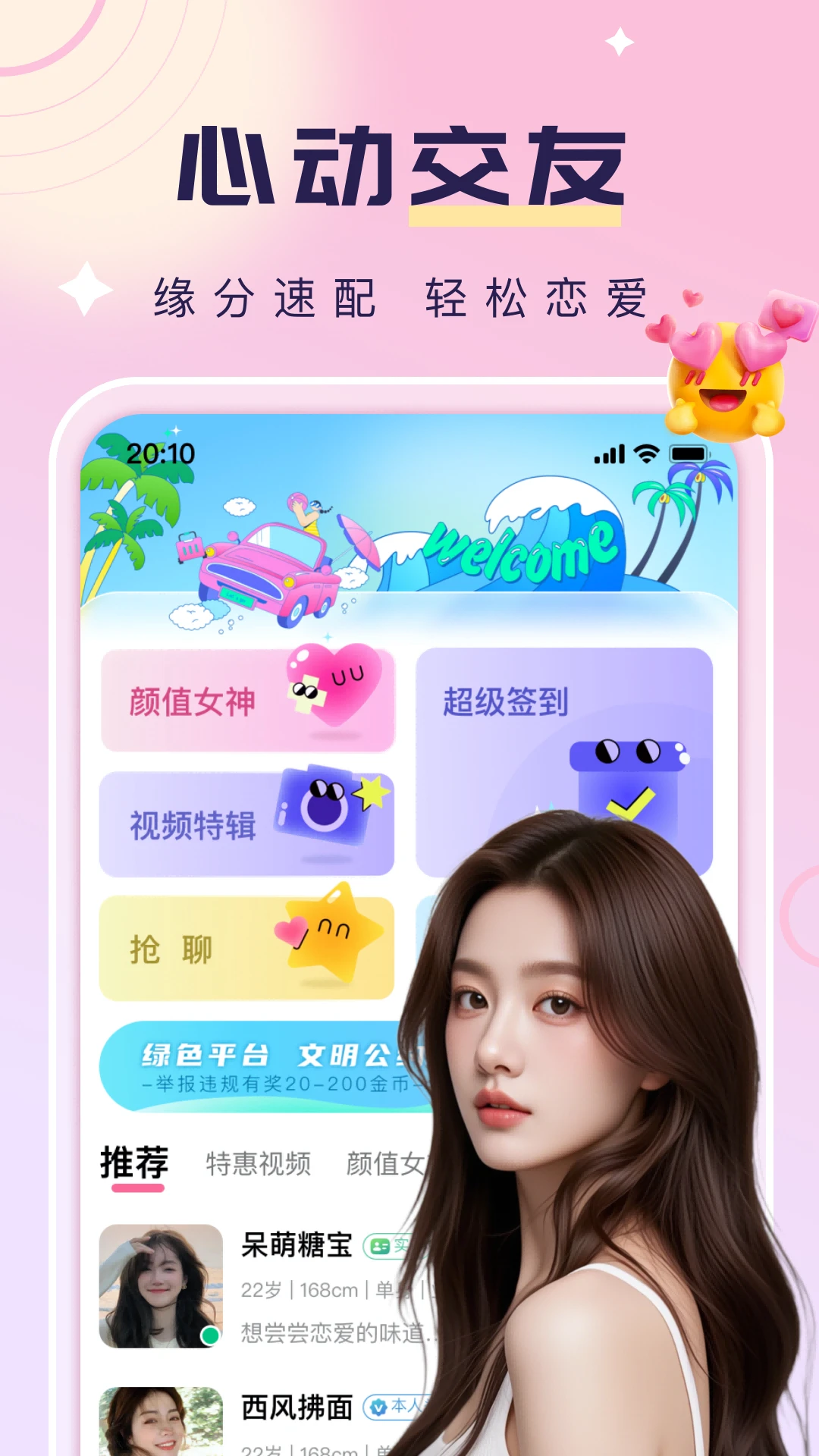 【高效匹配】我们根据你的兴趣和喜好,为你推荐周边的异性朋友,助你找到你的红颜或蓝颜知已真实陪伴】对用户要求实名认证,A人脸技术识别真人头像。系统还会根据颜值评分,筛选优秀女生