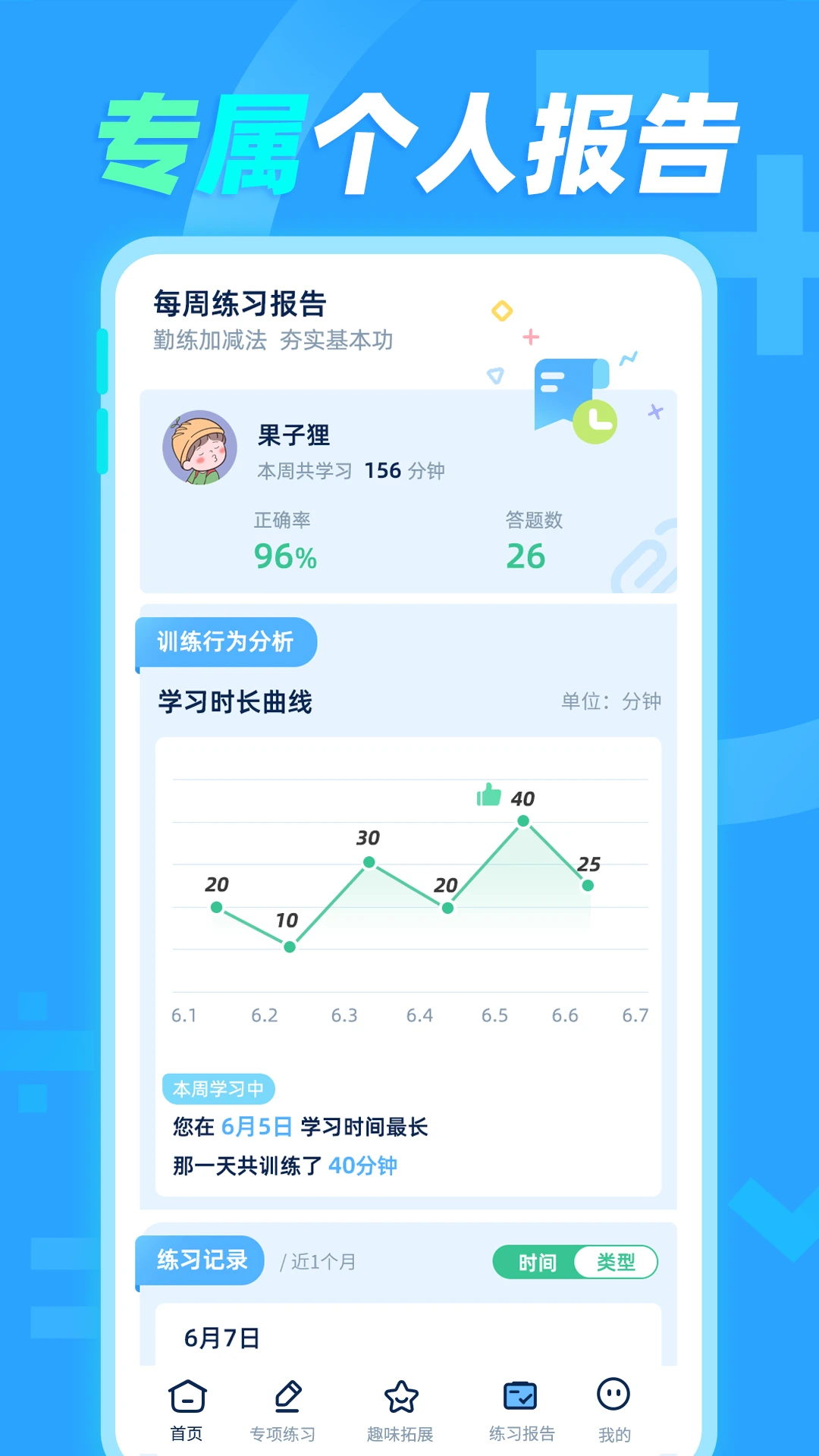 40+专项练习分阶段精细化设置口算计算题,帮助用户精准训练对应知识点