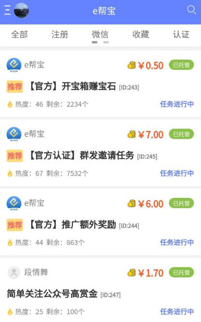 e帮宝是一款功能强大、操作便捷的悬赏任务平台,为用户和商家提供了高效的任务发布与完成渠道。无论你是想赚取额外收入,还是需要快速完成特定任务,e帮宝都能满足你的需求。在这里,你可以轻松发布任务,也可以领取各类悬赏任务,涵盖注册、下载、体验、分享等多种形式。平台任务类型丰富,单价超高,在家即可完成,每天都能轻松赚取佣金,是兼职赚钱的理想之选。