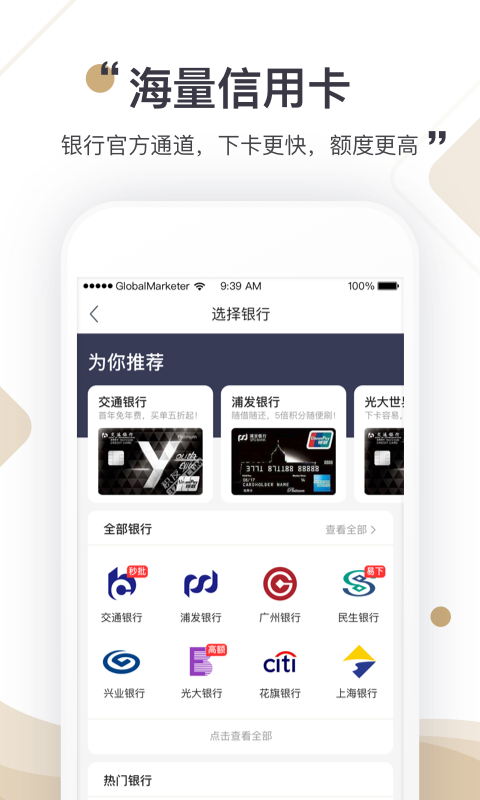 环球推手是一款专业高效的信用卡在线申请平台,致力于为用户提供一站式信用卡办理服务。作为市场上领先的金融工具类应用,环球推手整合了国内主流银行的信用卡资源,通过智能匹配系统帮助用户快速找到最适合自己的信用卡产品。无论您是初次申请信用卡的新用户,还是希望提升额度的资深持卡人,环球推手都能为您提供优质的金融服务体验。