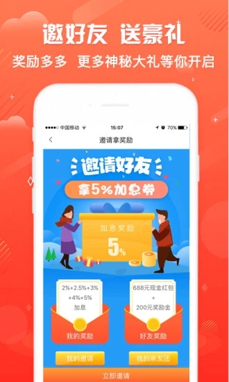 邀请好友奖励机制:邀请新用户注册投资,邀请人可获得加息券奖励,被邀请人还能获得理财金和额外奖励金,真正实现双赢。