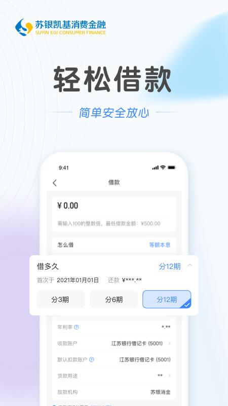 苏银凯基消费金融有限公司旗下互联网信贷产品,为您提供安全、专业、便捷的现金贷服务。平台汇聚金融科技精英团队,运用大数据风控和人工智能技术,打造智能化信贷服务体系。可实现在线申请、审批;支持7×24小时在线服务,实时到账;最高额度20万元,年化利率最低9%起(单利),最长借款期限12个月。我们致力于为用户提供灵活多样的借款方案,满足不同消费场景的融资需求。