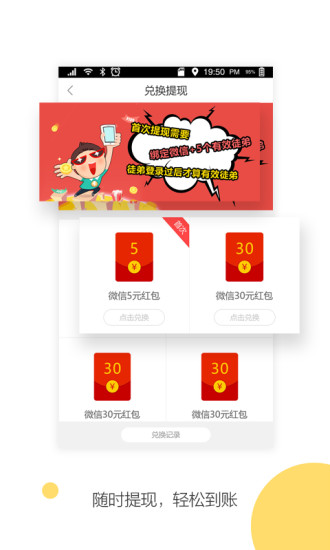随时提现:支持微信红包随时提现功能,收益到账快,让你真正感受到红包领到手软的快乐体验。
