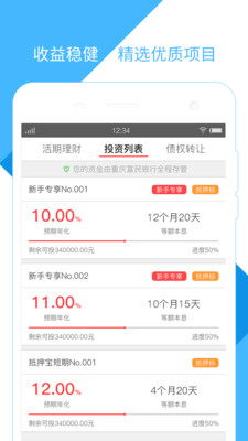 一两金融app是由杭州乾袋科技有限公司精心打造的一款专业金融理财软件。作为国内领先的互联网金融平台,该应用凭借其强大的国资背景和严谨的风控体系,为用户提供安全可靠、收益稳定的多元化理财产品,帮助用户实现财富的保值增值。