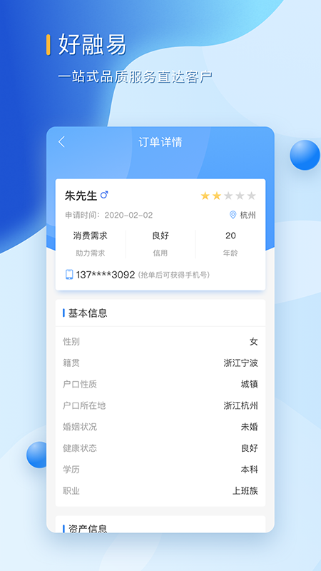 一键接单:系统实时推送优质订单,客户经理可快速响应需求。订单详情清晰展示,重要信息一目了然,有效解决传统信贷服务中的信息不对称问题。