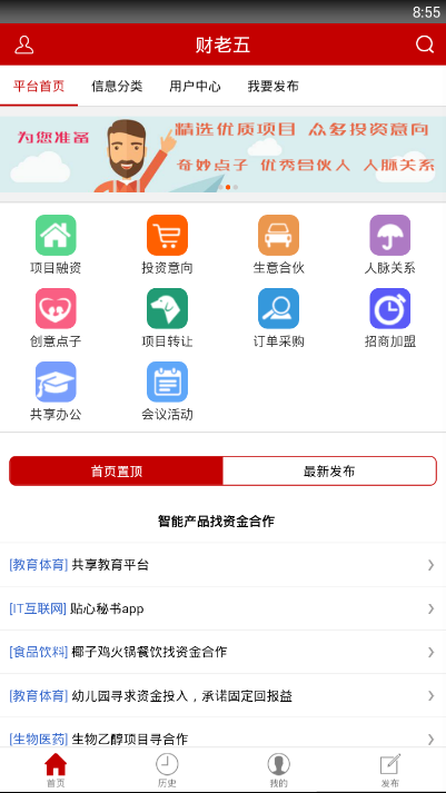 财老五移动应用是创业者的随身助手,集成了项目融资、投资对接、商业合作、人脉拓展等核心功能。用户可以通过app发布创意点子、寻找项目转让机会、对接订单采购需求、了解招商加盟信息。平台还提供共享办公空间预约和创业活动报名服务,让创业者随时随地获取所需资源。app采用智能匹配算法,能够根据用户需求精准推荐合适的项目和合作伙伴,大大提高创业效率。