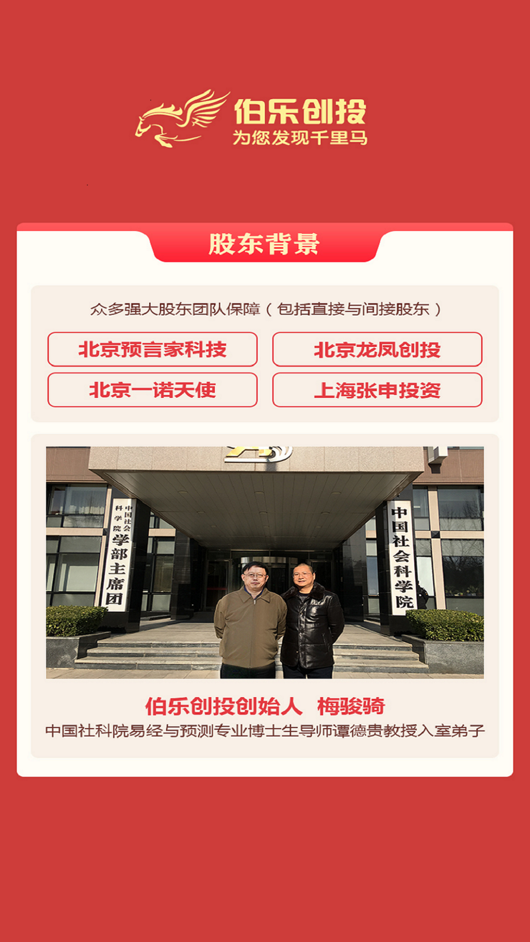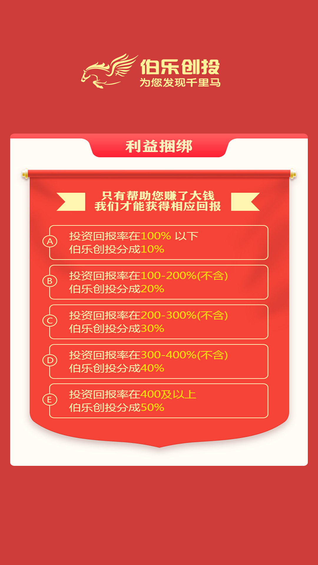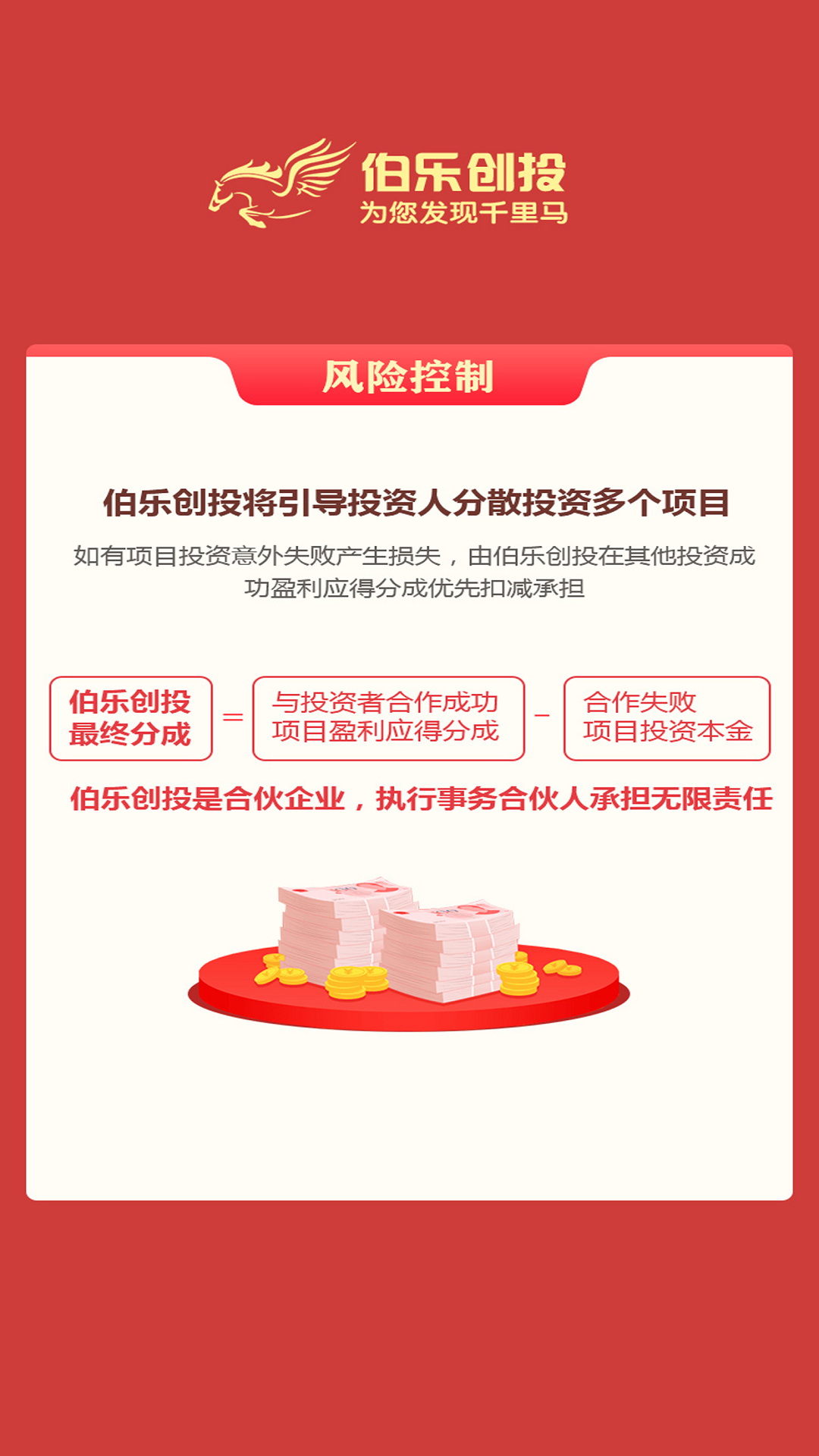 "伯乐创投"是一家持有正规金融牌照的互联网天使投资平台,专注于发掘具有高成长潜力的初创企业。平台创新性地采用"全民天使"模式,降低投资门槛,让普通投资者也能参与早期项目投资。我们拥有专业的项目评估团队,通过严格筛选确保项目质量,同时提供投后管理服务。平台致力于打造多方共赢的生态系统,既帮助创业者获得资金支持,又为投资者创造财富增值机会,实现资源优化配置。
