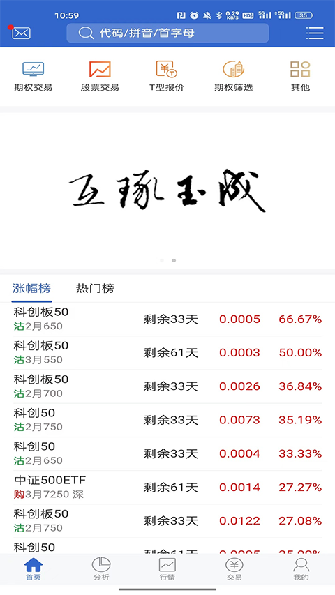 投资者可以通过该平台获取最新的市场行情,进行深入的数据分析后,即可直接登录交易账户进行安全便捷的在线交易。目前平台支持科创板50、科创50等热门股指期权交易,以及50ETF、300ETF等主流ETF期权交易。为帮助投资者优化交易决策,软件特别设计了智能期权筛选功能,支持从最新行情、涨跌幅、买卖价差等多个维度进行精准筛选。此外,专业的期权策略分析模块能够为投资者提供定制化的投资建议,帮助构建科学的期权投资组合。