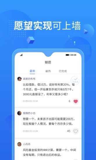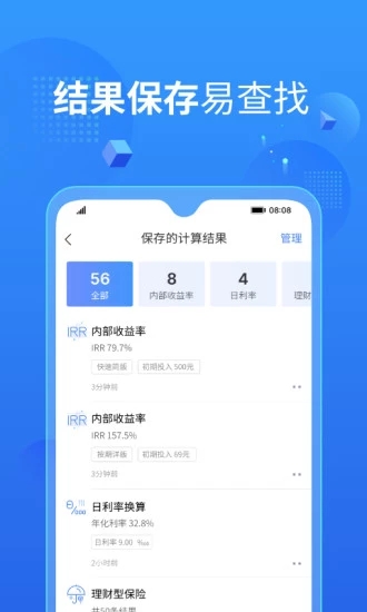 用途广泛、多种功能。可以计算内部收益率-IRR、日息结算的短期贷款年化利率、对比保险产品与理财产品收益、融资租赁项目收益、计算小金库的未来利息等。这款app几乎涵盖了所有常见的金融计算场景,让您无需切换多个工具。6种常用计算器,覆盖日常与工作需求,每种计算器都配有详细的使用说明和示例;简化了复杂的公式规则,极大节省操作和学习过程,即使是金融新手也能轻松掌握;可对计算结果进行保存,方便随时查看对比,支持导出为多种格式;可对计算结果进行更名,便捷查找记录,让数据管理更加有序;重复数值只复制不粘贴,无需反复输入,节省宝贵时间;得出结果后可变更任意参数,重新计算,灵活调整计算方案;夜间模式切换,减少刺激,护眼更科学,保护您的视力健康;按键音提示,防止误操作,确保输入准确性;留言发表自己需求和观点,采纳后上墙,与开发者直接沟通改进产品。