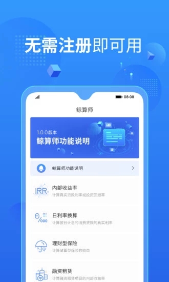 鲸算师是一款兼顾工作和生活的计算器应用,为用户提供全方位的数字计算解决方案。它不仅能满足日常生活中的简单计算需求,还能处理专业的金融计算任务,是您理财规划的好帮手。集合了包括IRR计算器在内多款工作及生活中必备计算工具,覆盖了从个人理财到商业分析的各个领域。内有内部收益率、日利率换算、型、融资租赁、梦想基金和攒钱计划等计算器,每种工具都经过精心设计,确保计算结果的准确性。并有结果保存、重命名、鲸愿意见墙、夜间模式、按键音防错等附加功能,让操作更便捷,体验更舒适~!这些贴心设计让计算过程更加人性化,大大提升了使用效率。