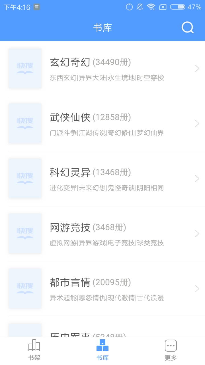 快搜小说大全,书迷必备免费看书神器,海量完结小说追书轻松,各种类型,这款阅读器比较适合广大男性朋友,除了网络小说也有许多经典名著图书阅读。女性读者也能在这里找到丰富的言情、穿越等题材作品。在线看书轻松,支持缓存随时阅读,阅读界面上看去清爽舒服,也可自定义设置字体等界面。特别优化的内存管理让应用运行更流畅,长时间阅读也不会卡顿。