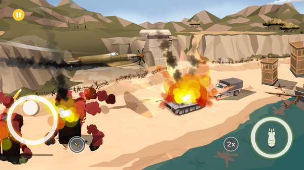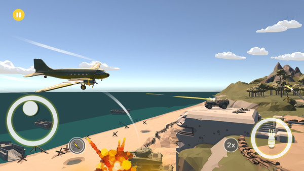 投弹攻击按钮:右下角炸弹按钮用于释放强力空袭,玩家点击即可投下炸弹,对地面目标造成巨大爆炸伤害。掌握投弹时机和角度是完成轰炸任务的关键。