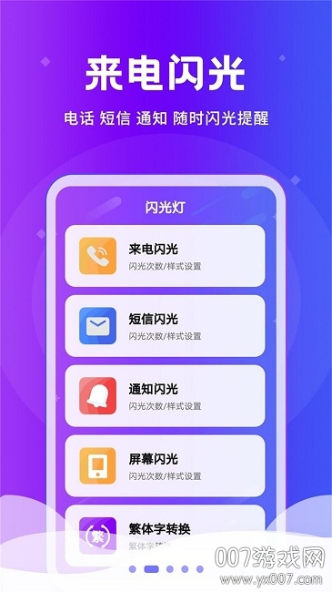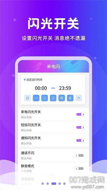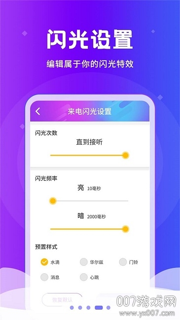 闪光设置功能强大,可以自由调节闪光强度、频率和颜色,真正属于你的闪光。闪光灯效果出众,重要的电话信息不再错过,即使在嘈杂环境中也能清晰感知。来电闪光支持多种动画效果,电话短信通知随时闪光提醒,让通讯充满乐趣。屏幕闪光技术独特,手机屏幕四边颜色闪光提醒,视觉效果更加震撼。闪光开关设计人性化,设置闪光开关消息绝不遗漏,使用更便捷。
