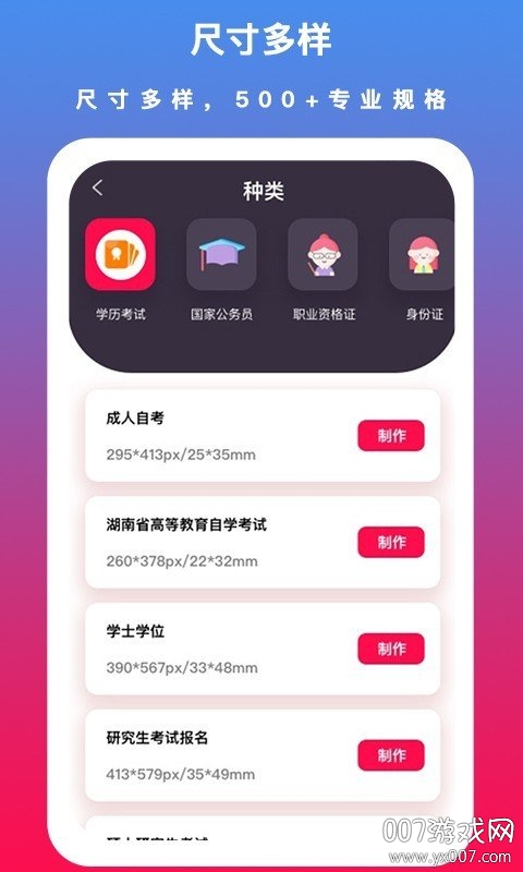 拥有500多种证件照规格是该应用的核心优势之一。从最基础的一寸、二寸证件照,到各类考试报名照片(如专升本、成人高考、四六级考试、普通话测试等),再到各类职业资格证书(如教师资格证、导游证等)以及各国签证照片(包括泰国、日本等热门旅游国家签证),几乎涵盖了所有常见的证件照使用场景。应用还提供智能裁剪功能,可以根据您需要的规格自动调整照片尺寸,确保人像位置和比例完全符合证件照标准。一键换底功能让您轻松切换不同背景色,而自然美颜功能则能在保持证件照真实性的前提下,对人像进行适度美化处理,包括磨皮、美白、瘦脸等效果,让您的证件照既专业又美观。